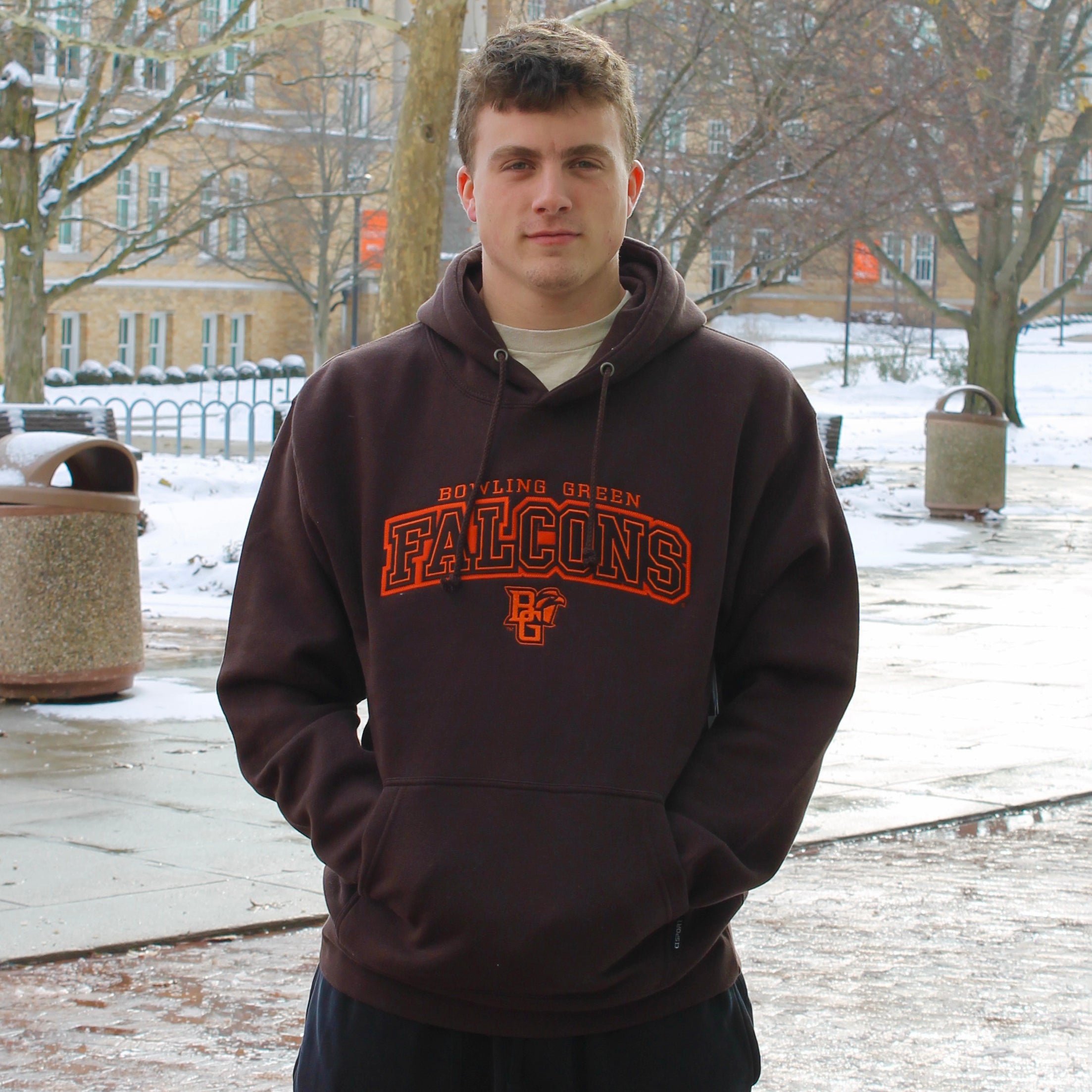 A rich brown hoodie featuring crisp orange embroidered Bowling Green Falcons lettering. Soft, classic and easy to wear, it delivers the perfect blend of comfort and standout school spirit for any BG fan.