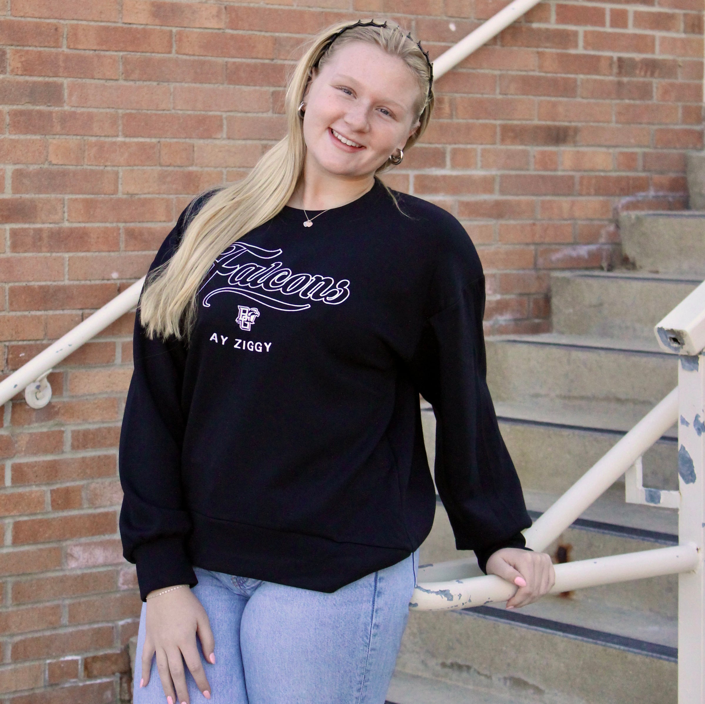 Show your Falcon pride in cozy style with the League Ladies Falcons Ay Ziggy Monterey Crew. Featuring a relaxed fit, this crew brings the perfect mix of comfort and spirit. The Falcons script and “Ay Ziggy” design adds a fun, spirited touch, ideal for chilly game days or casual campus wear.