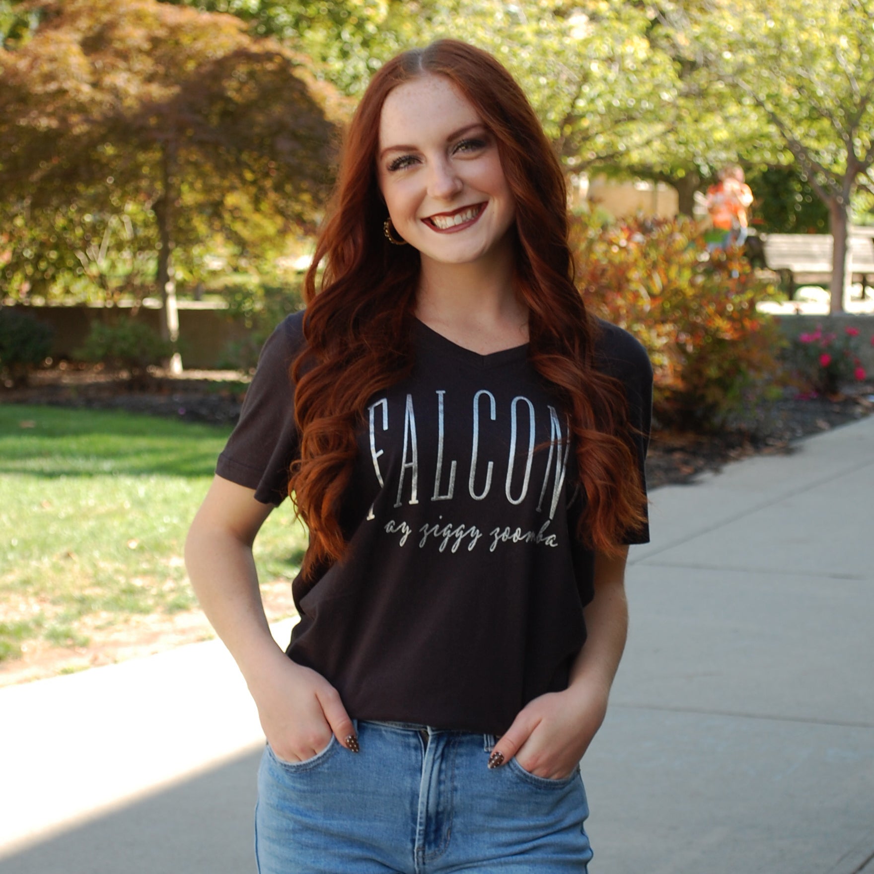 This black v-neck tee combines casual style with Falcon spirit. The front features bold “FALCONS” lettering with the phrase “ay ziggy zoomba” scripted underneath, adding a spirited touch. Made from a soft, flowy fabric, it’s perfect for pairing with jeans or layering for a laid-back game day look.